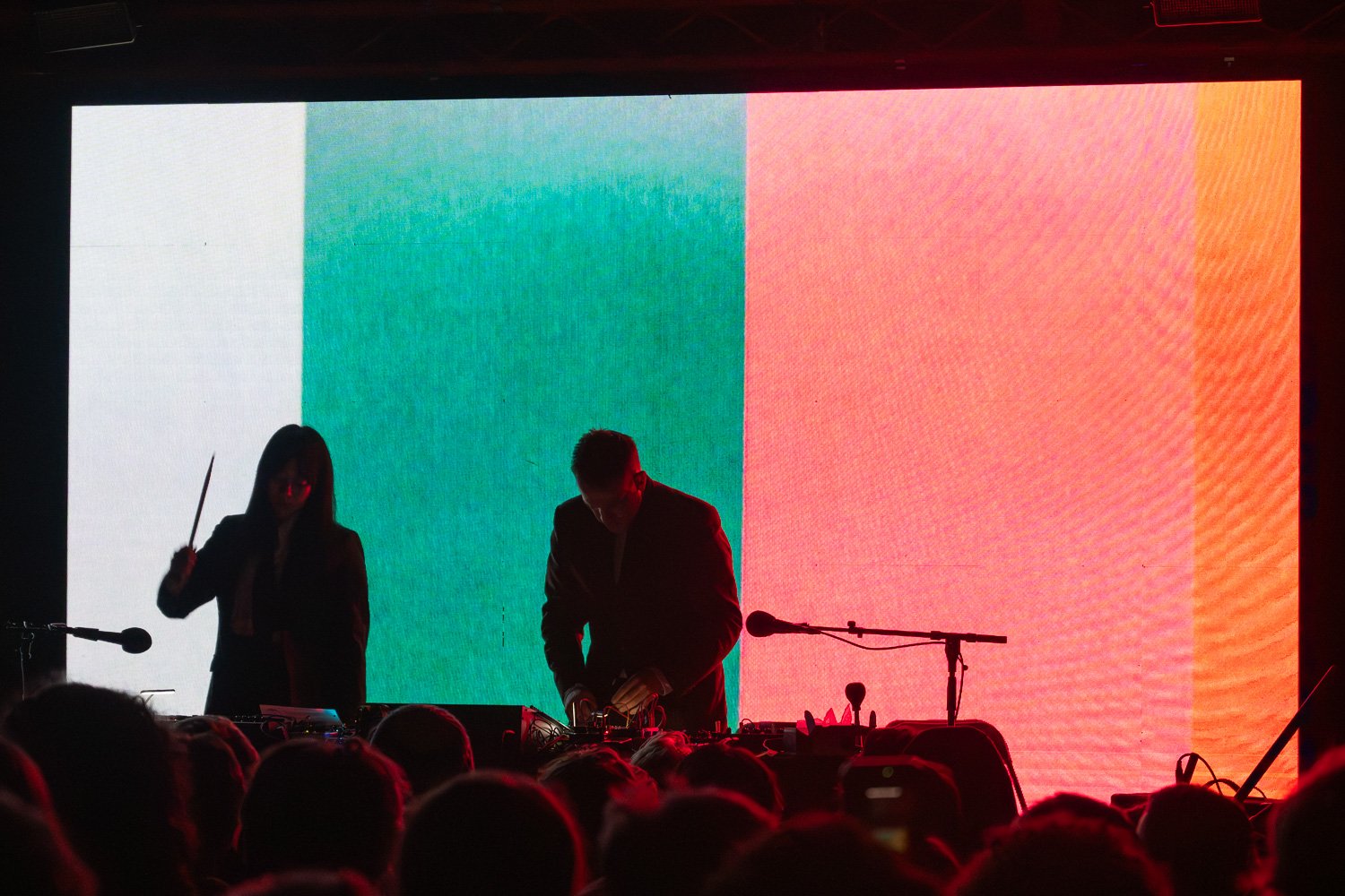 Then Xiu Xiu emerge from the cloaks behind the stage, in sharp suits and solemn expressions. There is a reverent feel, a hushed silence descends on the crowd. They sit in silence, in unison, behind the table lumbered with boards and synths and indescribable devices, laden like a science desk as opposed to a live set-up. The screen behind them flickers to life, a montage of black and white imagery stuttering behind them, indistinguishable patterns and motifs. Combining field recordings, homemade instruments and the occasional shout, they craft an uneasy feeling that settles in your skin, the same apprehensive nature that Lynch’s work evokes in the viewer.