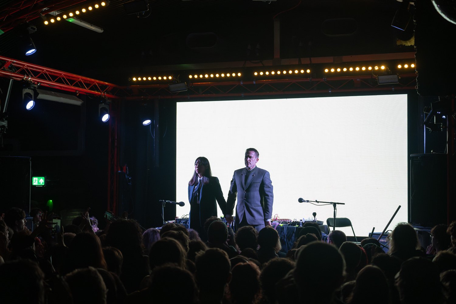 The night opens with Manchester experimental spoken word duo BurnIntoSleep, consisting of multi-instrumentalist David McLean and poet Katie McLean. The group’s identity is ambiguous, a single Instagram post is the only indicator of the acts’ presence, but dig further and you’ll find the two are ingrained in Manchester’s grassroots scenes – David running cassette-only Tombed Records, and both haunting DIY venue AATMA.
